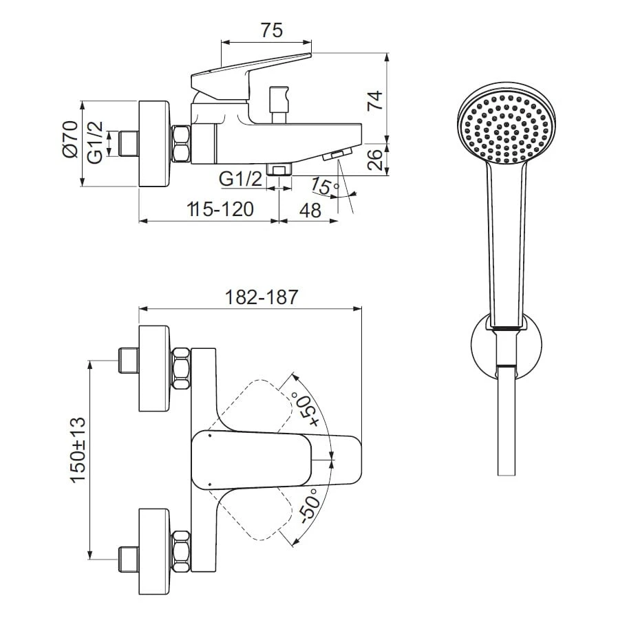 Ideal Standard Ceraplan Einhebel-Badearmatur Aufputz mit Handbrause-Set