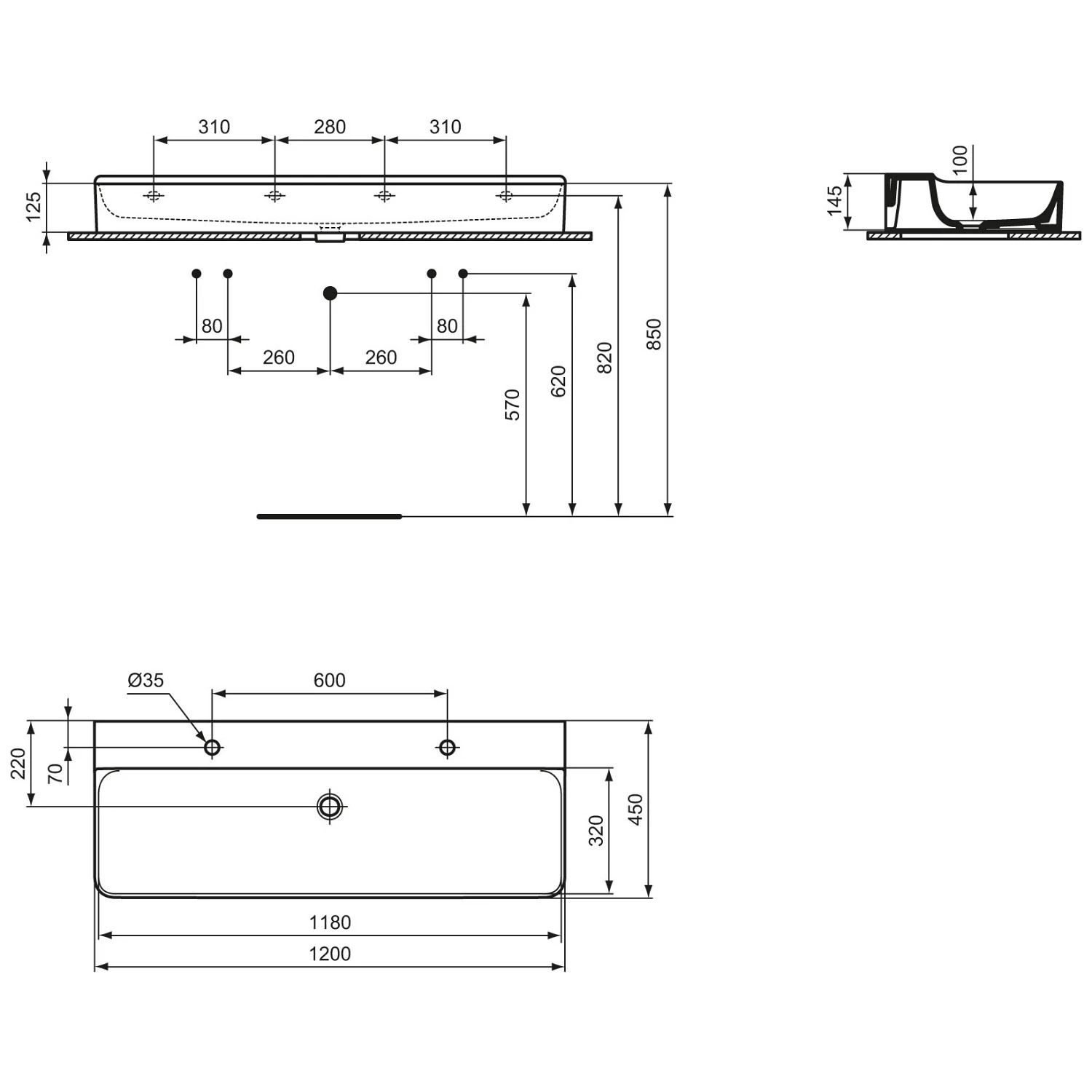 Ideal Standard Conca Waschtisch 120 cm, 2 Hahnlöcher, ohne Überlauf, geschliffen