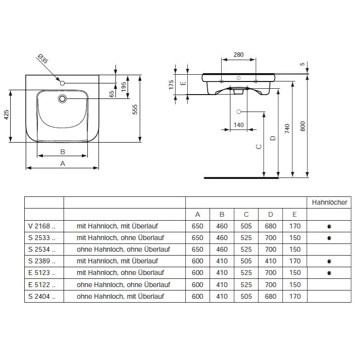 | Ausführung | ohne Hahnloch, mit Hahnloch, ohne Überlauf, ohne Hahnloch, ohne Überlauf, mit 1 Hahnloch |