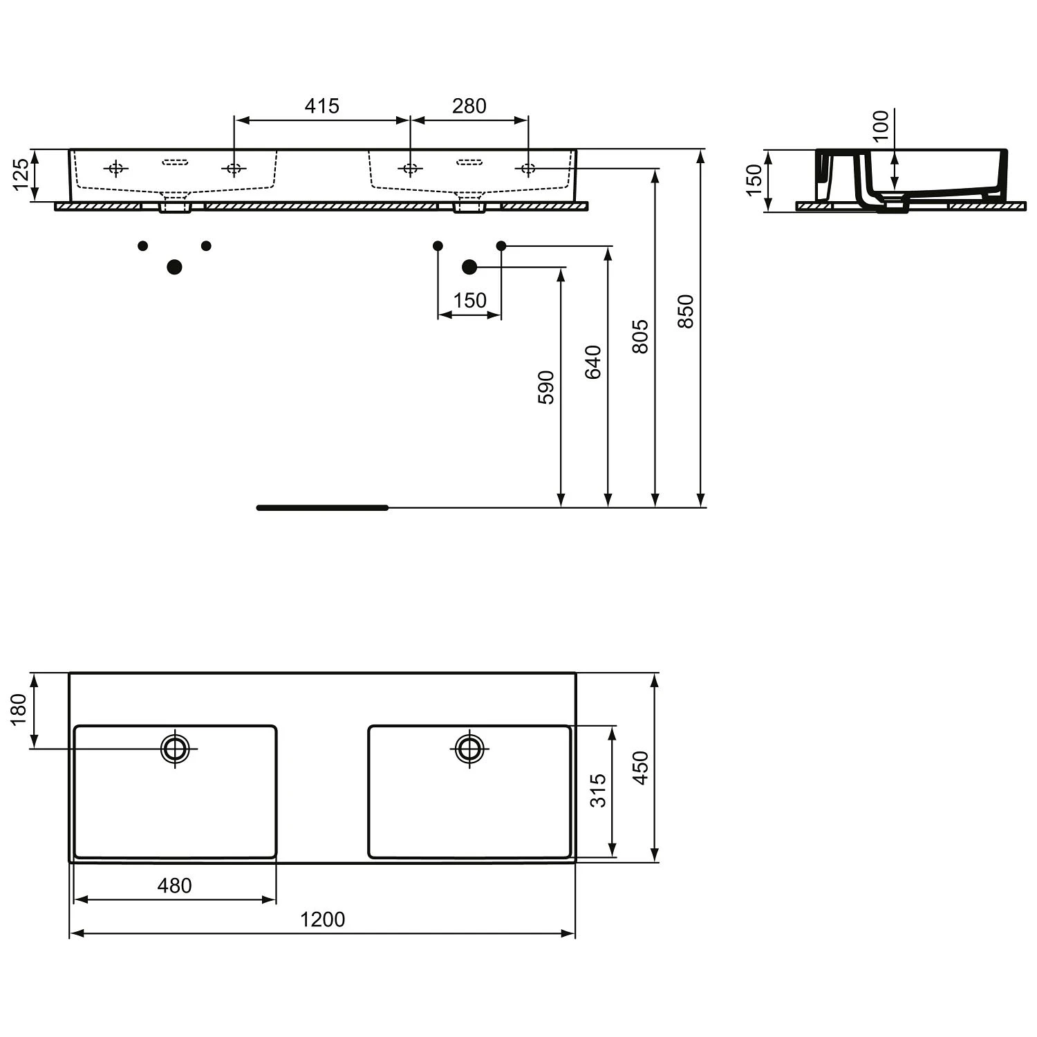 Ideal Standard Extra Doppel-Waschtisch 120 cm, ohne Hahnloch, mit Überlauf