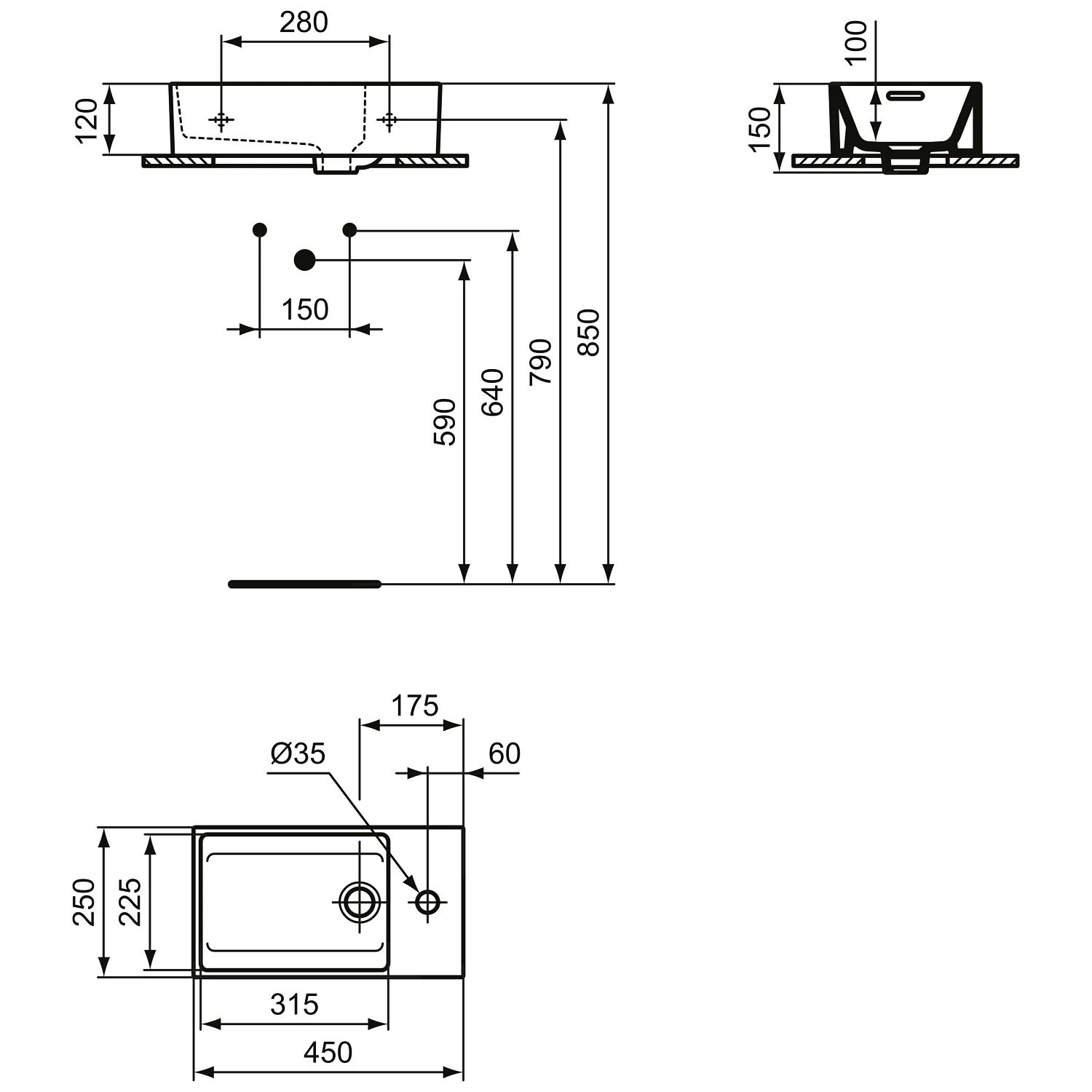 Ideal Standard Extra Handwaschbecken 45 cm, Hahnbank rechts, 1 Hahnloch, mit Überlauf