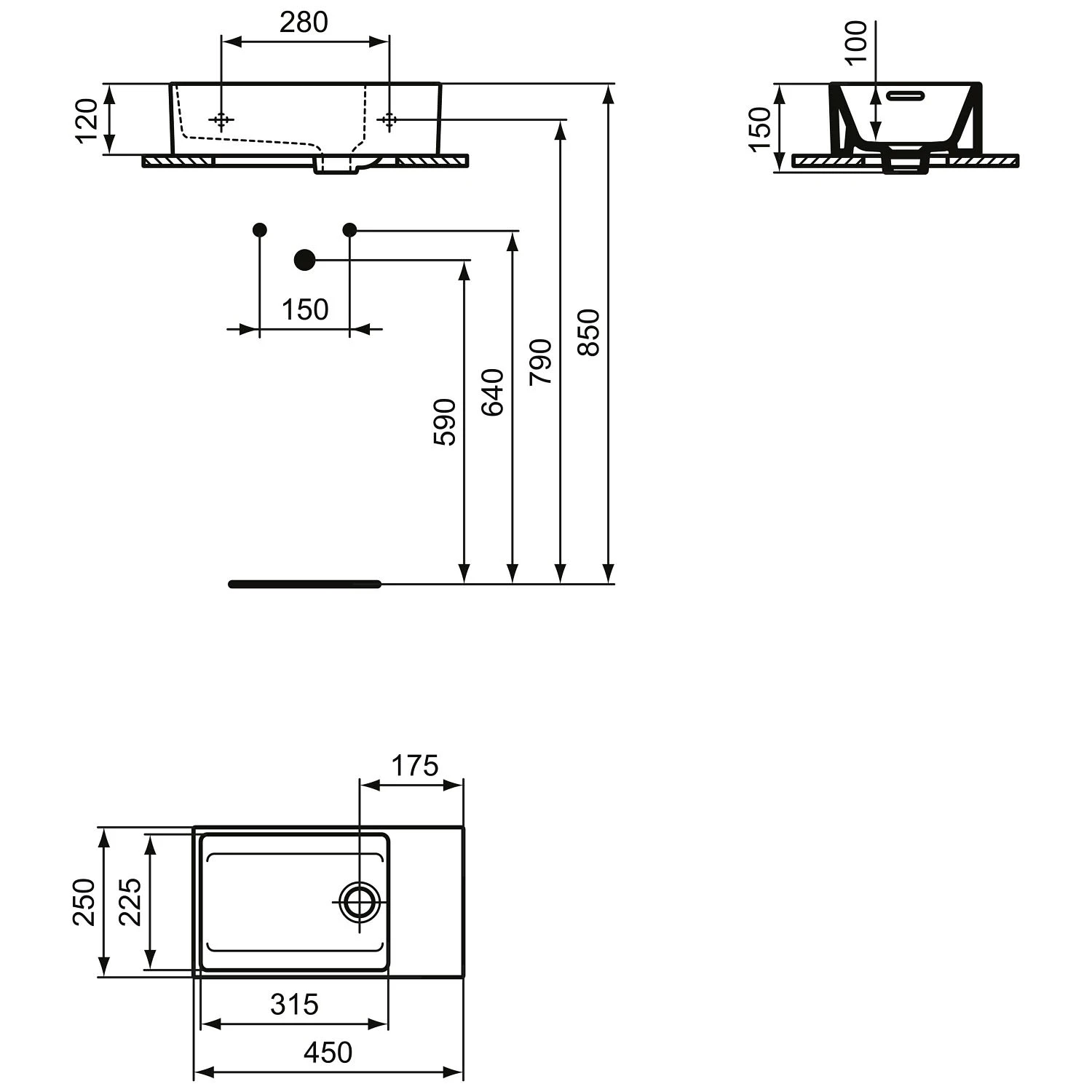 Ideal Standard Extra Handwaschbecken 45 cm, Hahnbank rechts, ohne Hahnloch, mit Überlauf, geschliffen