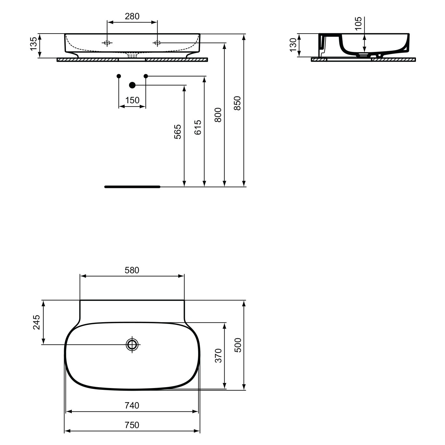 Ideal Standard Linda-X Waschtisch 75 cm, ohne Hahnloch, ohne Überlauf