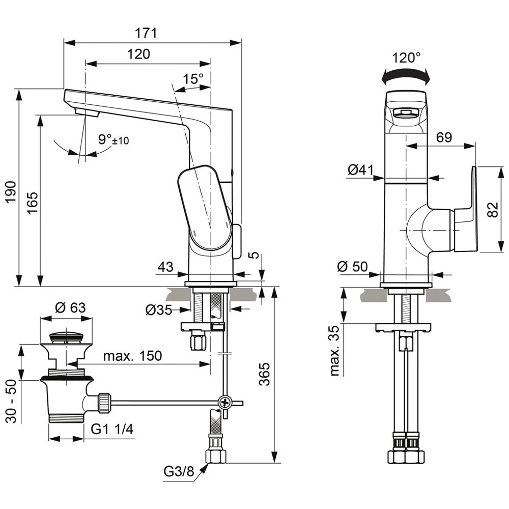 - Gussauslauf DN 15 mit 3 Einstellmöglichkeiten: 120° voreingestellt, sowie 70 und 360°
